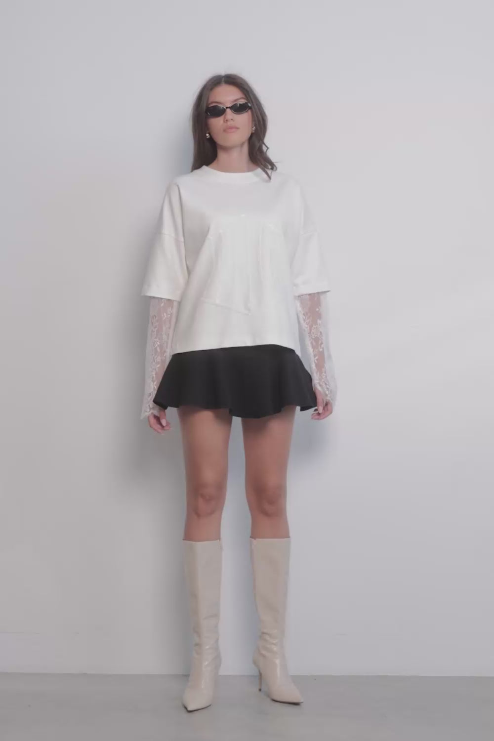 The Venice off white Top is designed for women who love elegance and comfort. Made from an incredibly soft and slightly elastic fabric, it offers an optimal fit and flattering silhouette. The dress features a handmade velvet corset, enhancing the luxurious appeal. It is perfectly long enough to be worn as a standalone dress. The lace is delicately sewn at the sleeves and the base, giving it a feminine and refined touch.